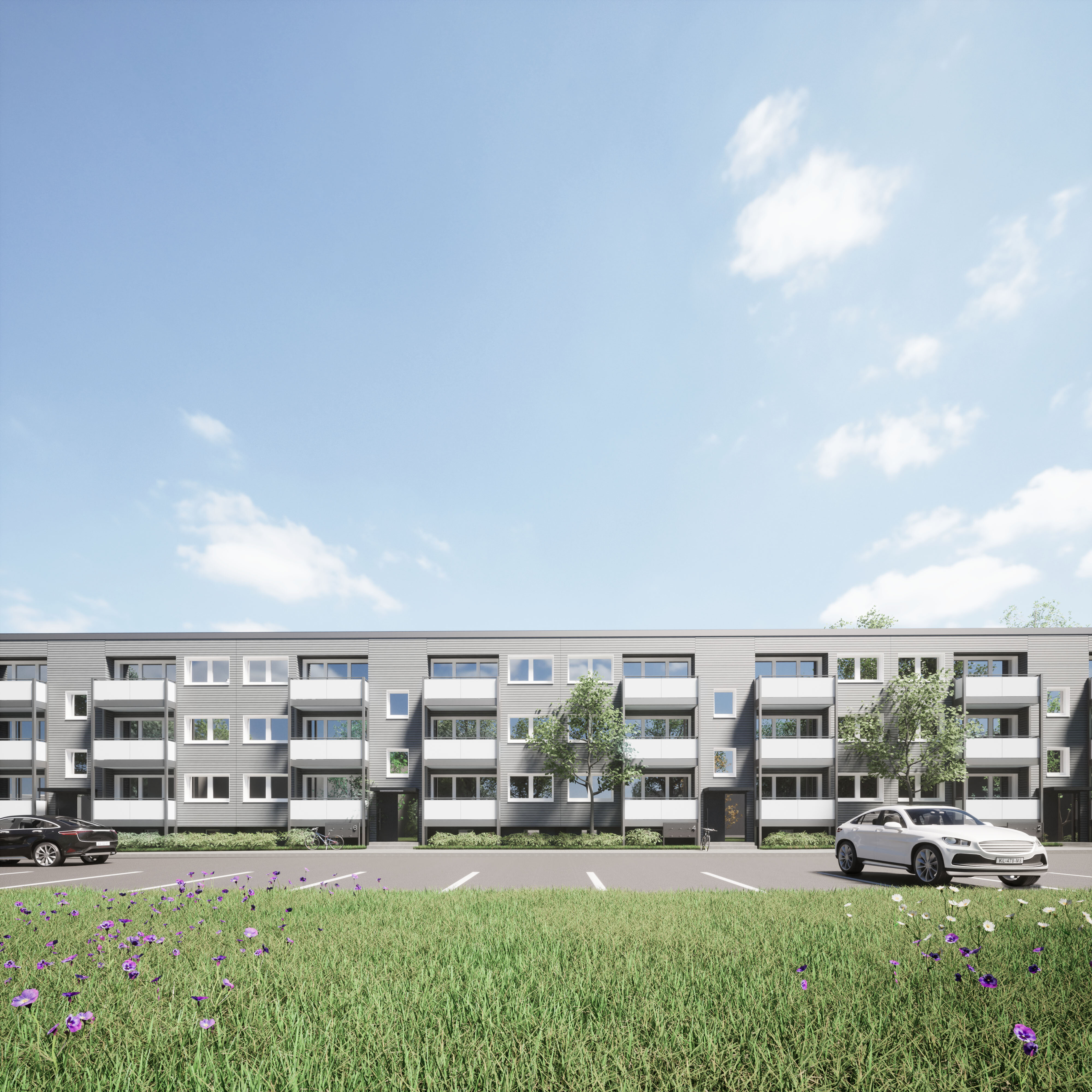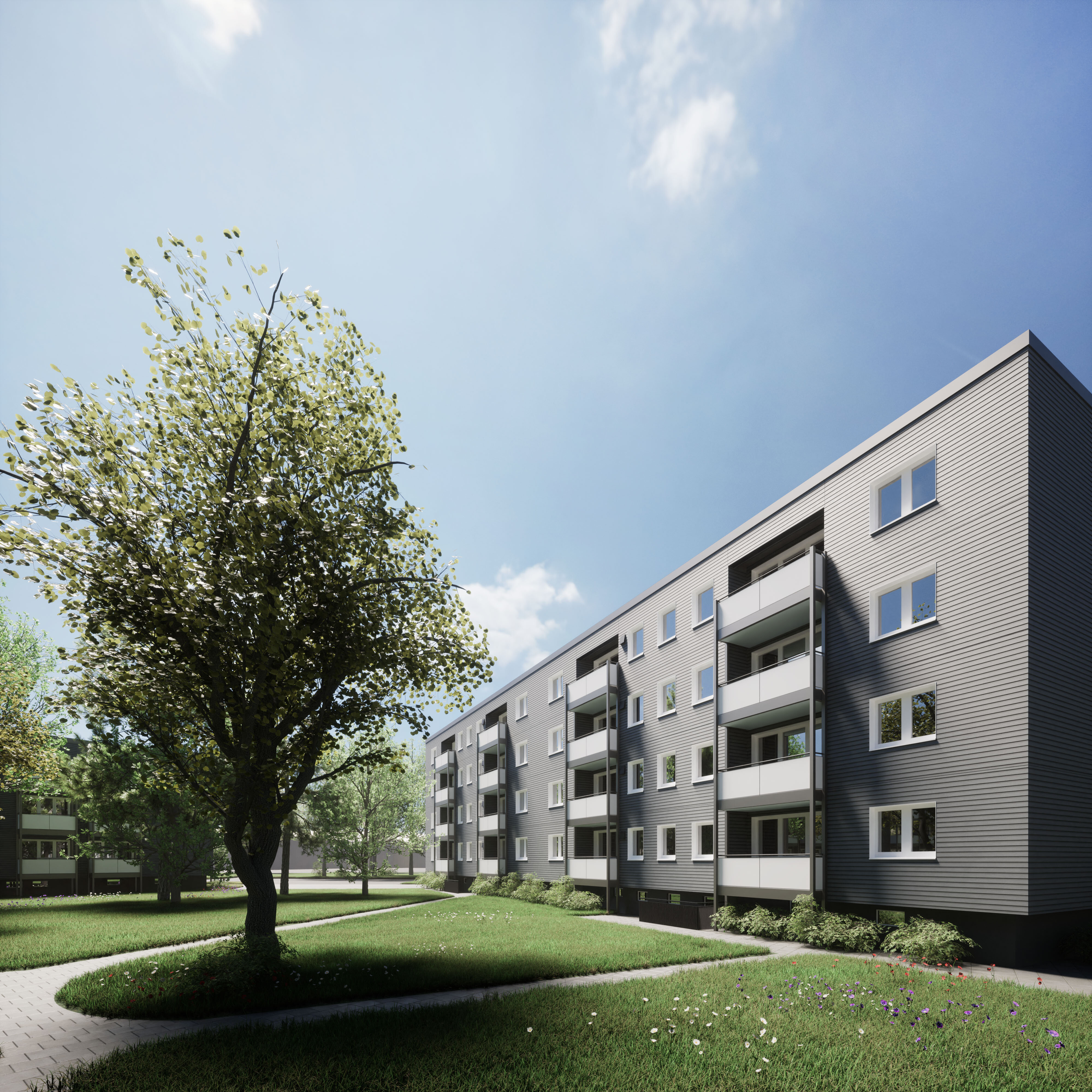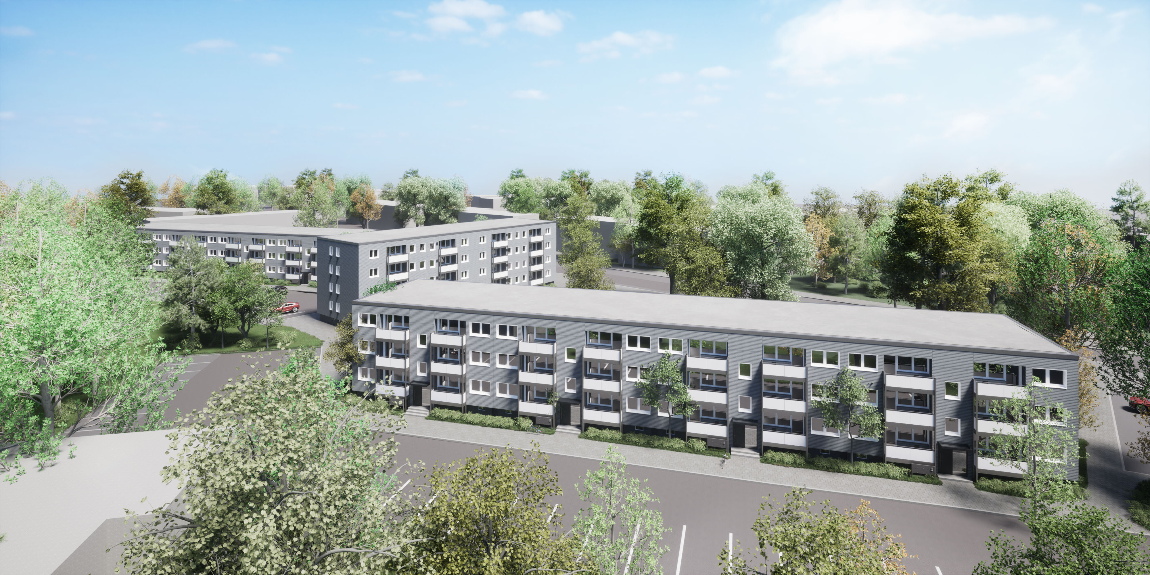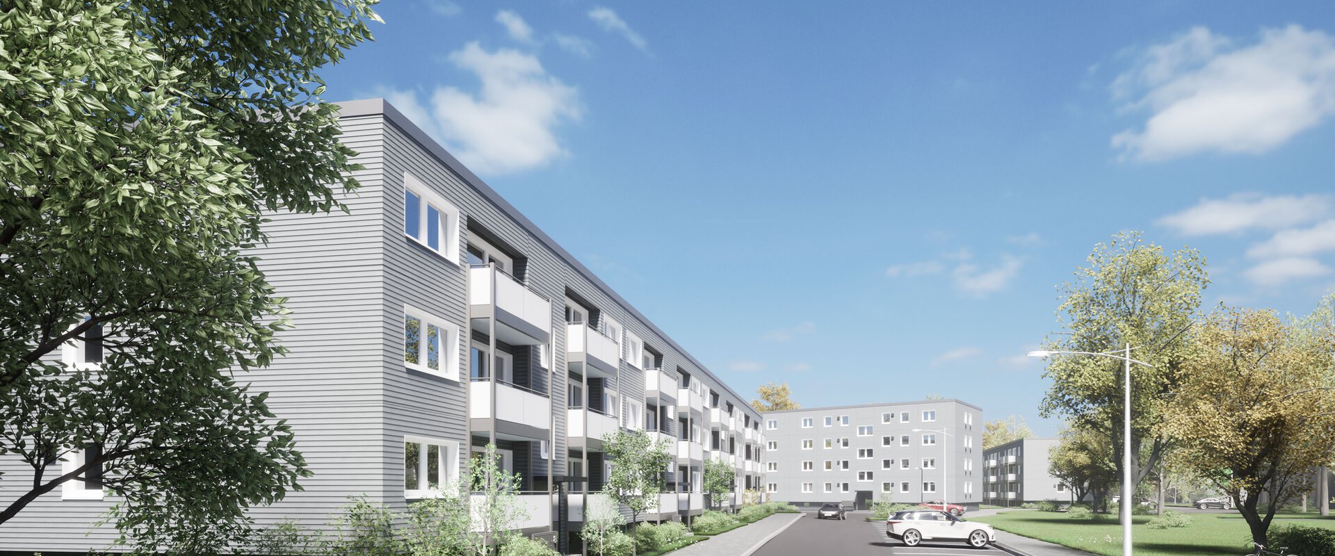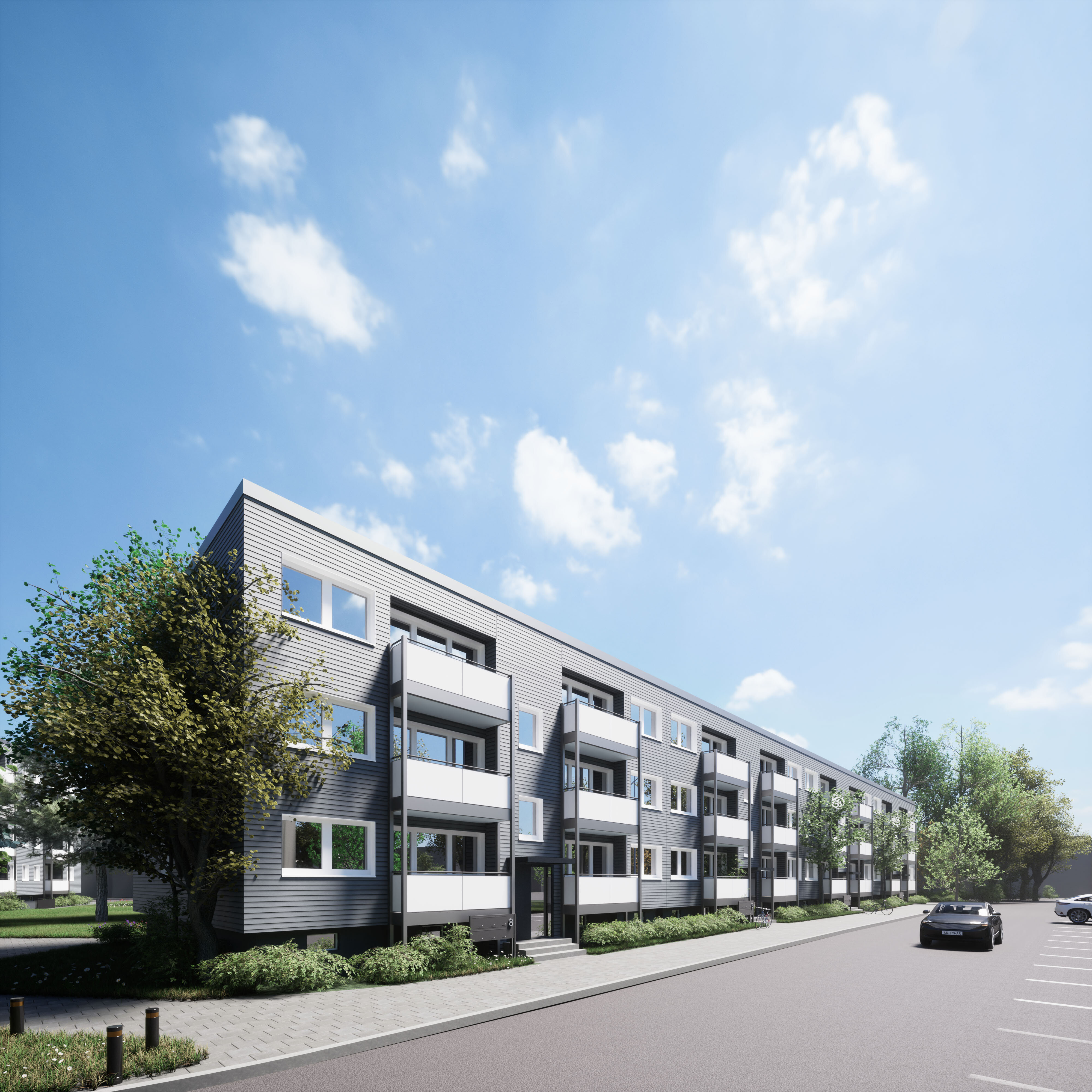 Die drei Mehrfamilienhäuser werden energetisch optimiert, um den KfW-Effizienzhausstandard 55 zu erreichen und den Wohnkomfort zu steigern.